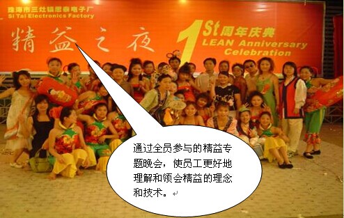 因此,非常有必要在全公司范围内广泛展开丰富多彩的精益宣传活动,将精益生产的理念和方法、精益改善的成果,尤其是员工参与的培训、研讨、改善、成果与表彰等相关活动在全公司范围内宣传和展示,使员工充分体验精益改善的氛围和文化,更好地参与精益改善并融入企业。