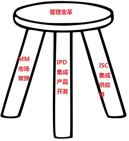 业界最佳的业务管理模型包括三个紧密联系的主要业务杠杆。它们是:建立和保持对市场发展趋势的远瞻——市场管理;通过IPD进行的产品革新和开发管理;通过供应链管理实现的最佳成本效率,满足企业发现价值、创造价值、传递价值的目的。就像一个三条腿的凳子一样,如图7-1,每条腿对于支持业务的效果都是十分重要的。