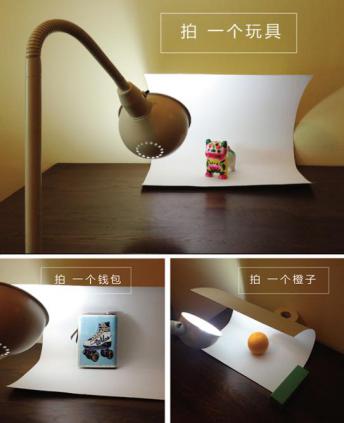 第二种,室内光线不够充足的情况下,找一盏台灯作为漫反射光源,灯光不要直射产品,将光线投射在白纸的顶端,光线会从顶部反射到产品上,形成简单的影棚效果,如图2-24所示。