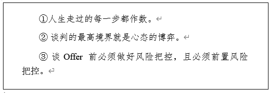 第二个重要启示:谈Offer前必须做好风险把控,且必须前置 风险把控。回想起来,当时候选人来见我的时候,她的心里已经有 了决定。一个人做决定的时候是有决策成本的,因为大脑特别懒惰, 能不动就不动。所以,当一个人作出了决定,想要再改变就会非常 困难。因此,我得出了一个至关重要的结论就是风险把控是需要前 置的。甚至应该在断定候选人是“红花”的第一时间就应该开始做 风险把控。否则,就丧失了主动权,只有被通知的命运了。