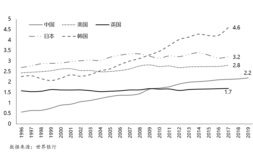 图4-11 各国研发支出占GDP的比重(%)