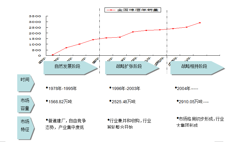 在这个过程中,中国啤酒经历了三个阶段:1978—1995年的自然发展阶段、1996—2003年的战略扩张阶段、2004年以后的战略相持阶段。如图1-21所示