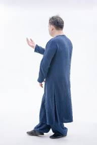 8.左脚底往下踩,带动腰胯将右脚尖向左旋与左脚成45度;左手腕再向上外侧卷出,掌心朝下。右手外形不变,由腰胯带动肩膀转正,手掌心由内向外卷出,掌心朝下,不超前于左手尾指,左手上于鼻高,右手下于胸前。此定式为第一梭。