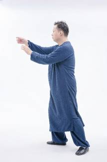 5.右脚踩下将重心平移至左脚心,同时左手荡起至胸前30厘米处,掌心朝内。