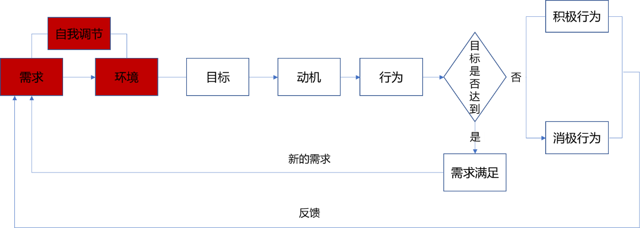 动机(动力)的来源是需求6,人无需求,就没有动机。但需求并不直接产生动机,它需要一定的刺激或诱因。当诱因出现时,个体会进行自我调节,使自身的内在需求与行为目标相协调,进而产生动机和行为。如图2-1所示。