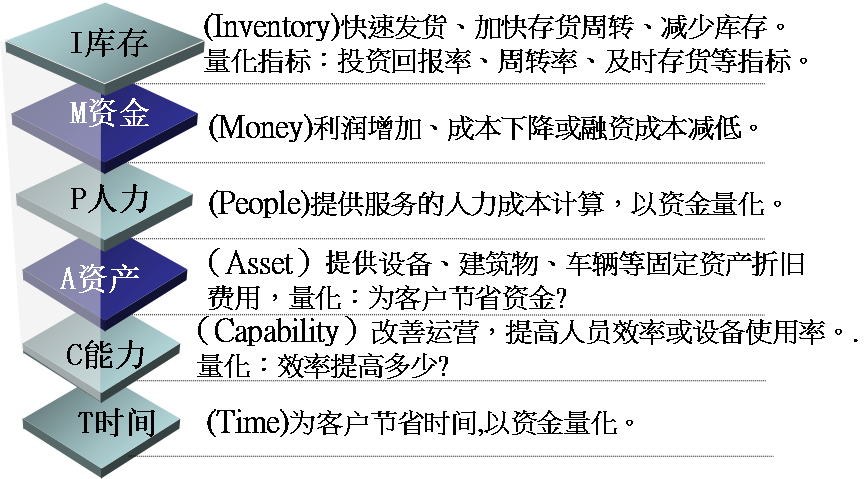 M代表资金(Money):利润增加、成本下降是最直观的提供给客户的利益,在量化其他指标时,将库存、人力、资产、能力、时间转换为“增加的利润和节省的资金”,能给人留下深刻的印象并且更容易被记住。