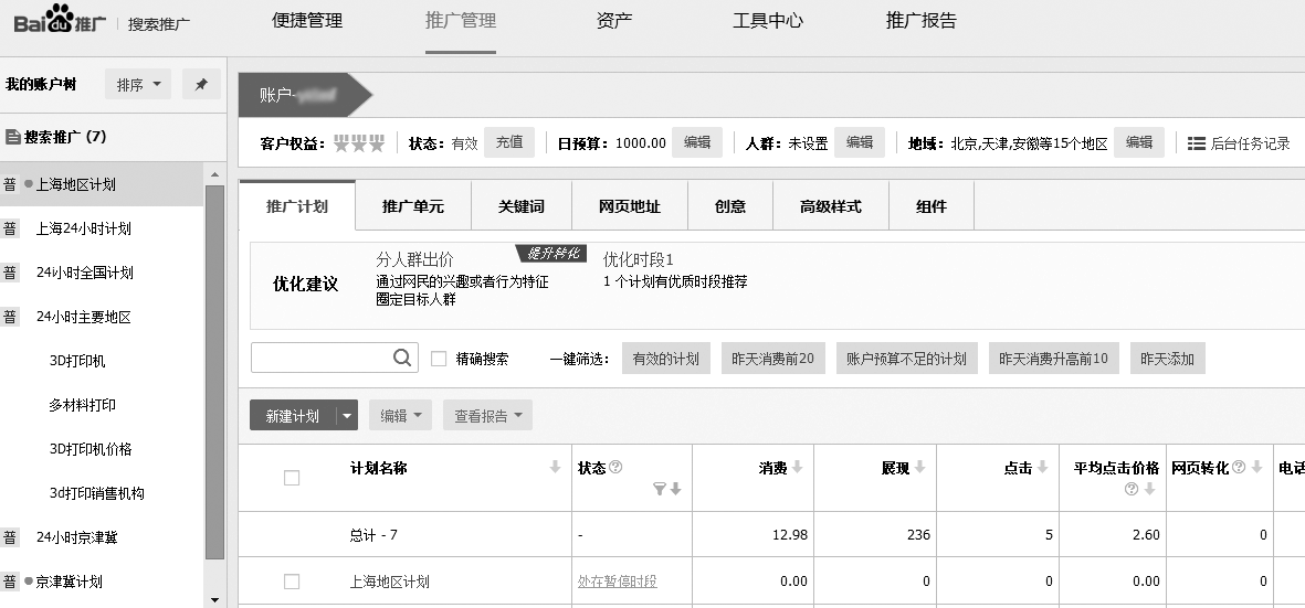 图3-8左侧就是百度推广账户的树状层级,分为三级:推广账户、推广计划和推广单元,最后一级推广单元里存有我们要推广的关键词。