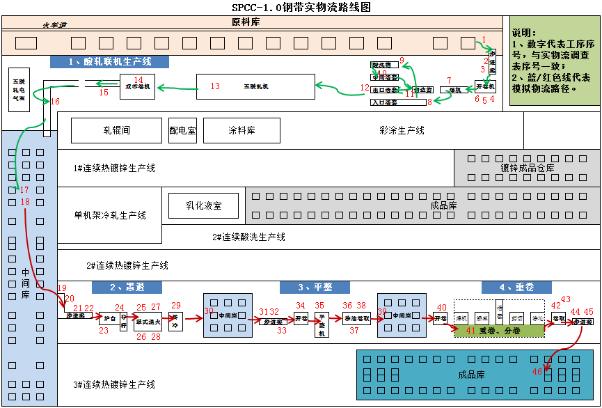 生产方式与中间库存的确认,如SPCC-1.0带钢采用孤岛生产,各设备周边存在大量中间在制品(具体可参见图5.20、表5.37),大多数品种都要被反复搬运、排队上机,导致制造周期被拉长且占用周转资金。