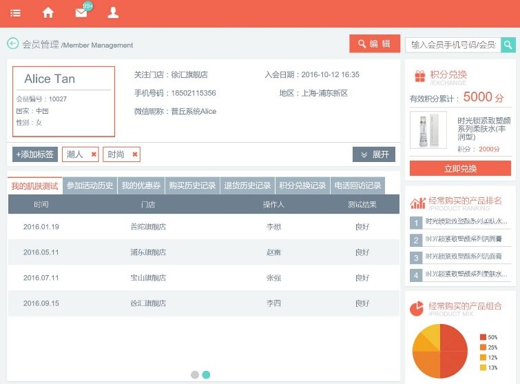 终端系统帮助集团层面营销部门将更多营销能力赋予了最前端的导购,让导购实现了营销数据的直接利用,也成为营销数据的重要入口,这是一次质的飞跃。另外,在营销形式与内容方面,会员也可以在终端便捷地进行积分兑换、使用各类优惠券、参加不同的促销活动。同时,终端系统新上线了肌肤测试功能,导购可以结合肌肤测试仪等硬件设备,掌握客户肌肤变化数据。它整合了销售、营销、客户肌肤数据,提高了会员活跃度。