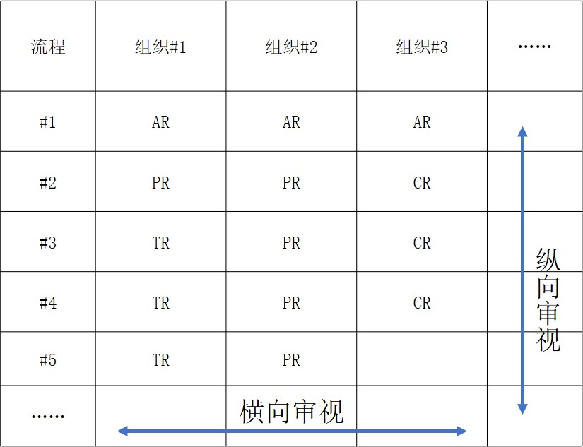 通过纵向、横向审视,定性分析组织对应角色的职责分配是否合理。过多AR或没有AR,过多或过少PR、TR、CR,都可能存在问题,需要根据组织的实际情况做一个判定。没有AR会出现职责缺失,过多AR则是组织职责有重叠之处,需要进一步明晰。过多的PR、TR、CR需要判断组织是否过载,是否有组织拆分、调整的可能;过少的PR、TR、CR则需要判断组织是否不足,是否存在取消、合并的可能。