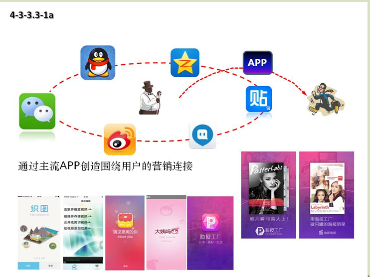 自移动互联网发展发来,一些APP通过提供杀手级应用积聚了大量用户,成为超级APP。超级APP允许应用开发商、商家、媒体等第三方接入,从而使APP本身成为一个分发平台,可以实施营销连接。以微信为例,用户数量上微信已达到6亿,集社交、资讯、游戏、支付、生活服务等多种功能于一体,可以算是典型的超级APP平台,其他还有陌陌、QQ空间、百度贴吧、微博、微店、支付宝等。在这些平台上都可以开通站点营销。同时还有些大用户量的APP,也可以注册账号在上面进行营销连接。