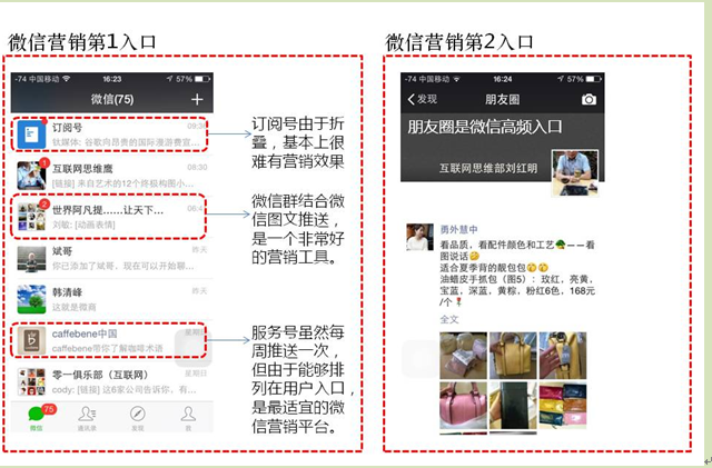 首先要明白,微信在什么地方做营销,就是微信营销入口。不占据微信营销入口,根本谈不上微信营销。比如很多企业开通微信订阅号做营销,他们不明白,订阅号根本没有占据微信营销入口,根本无法营销。这也是京东商城上了微信购物频道,仍然不见移动销售量有多少增长的原因,因为京东的入口是在微信的“发现”菜单栏,而且是在倒数第二排“购物”上。如果“京东”购物是像“腾讯新闻”一样排在微信营销第一入口,即微信实时联系人排列栏,那么京东的移动销售额肯定要飞速增长。