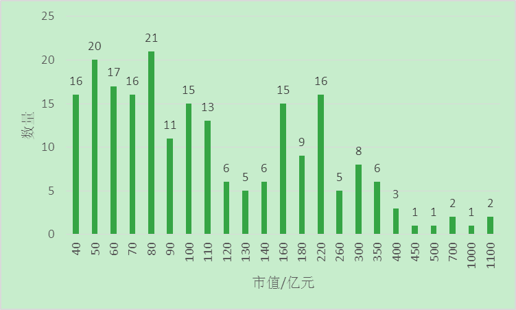 资本市场流行这句话:“50亿市值看主题,200亿市值看业绩,400亿市值看创新,800亿市值看国际对标。”从A股医药上市公司市值分布来看,大小市值分化严重。80亿市值以下的有一大堆,400亿市值以上的极少数。大部分医药上市公司还在为突破百亿市值努力中。如图4-8所示。