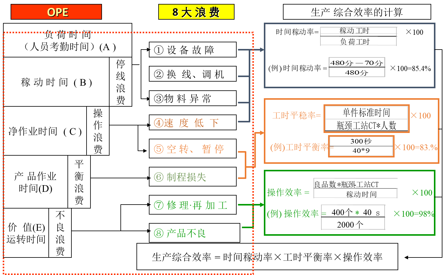 OPE由负荷工时、稼动工时、有效工时和价值工时四部分组成,OPE的计算工式为:OPE=时间稼动率×工时平衡率×操作效率=单件标准时间×良品数/负荷工时。