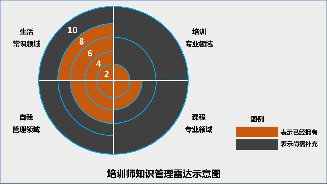 所谓知识管理的设计,指的是培训师基于自己的职业愿景和使命,预先规划好自己的职业成长路径和不同阶段的职业目标,并以此为主线,确定所需要的知识范畴和获取路径。