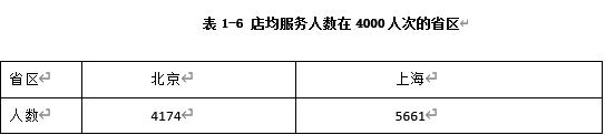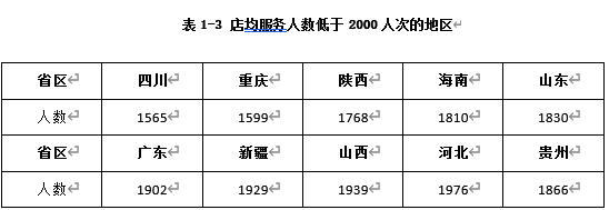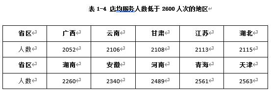 2.店均服务人数低于2000人次的地区达10个(见表1-3)。