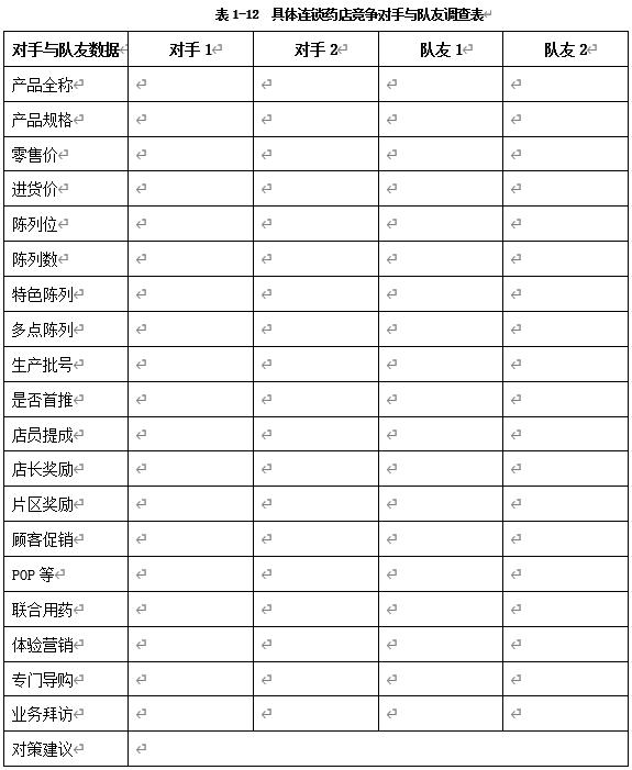 3.设计一些主要竞争对手与队友的重要参数(如产品全称、产品规格、零售价、连锁进货价、陈列位、陈列数、特色陈列、多点陈列、生产批号、是否首推、店员提成、店长提成、片区奖励、顾客促销、POP等数据),如表1-12所示。