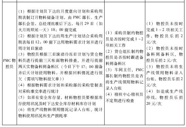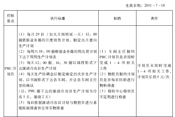 :我们赋予车间主任和物控员权利,他们可以对计划员进行制约。如果计划员未按时完成1-4项相关工作,计划员就要接受处罚,承担责任。