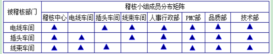 :从表6-3可以看出来,每天被稽核部门有三个:电线、插头以及线束。对于电线车间的稽核检查,以下部门要参加:稽核中心、插头车间、线束车间、人事行政部、PMC部、品质部和技术部,每一次的全员稽核,除了电线车间自己之外,其他部门必须到现场。