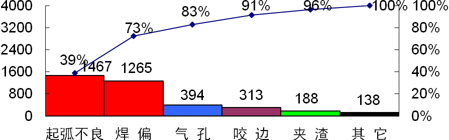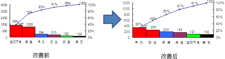 改善前后圆周焊接工序不良项目对比:改善后起弧不良、焊偏由原来的第1位、第2位降到第3位、第5位,如图2-44所示。