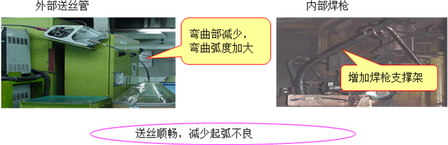 现场进行对比实验:送丝管曲处多,送丝不畅,产生起弧不良。
