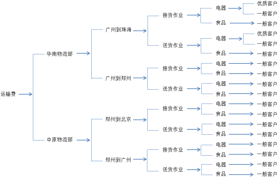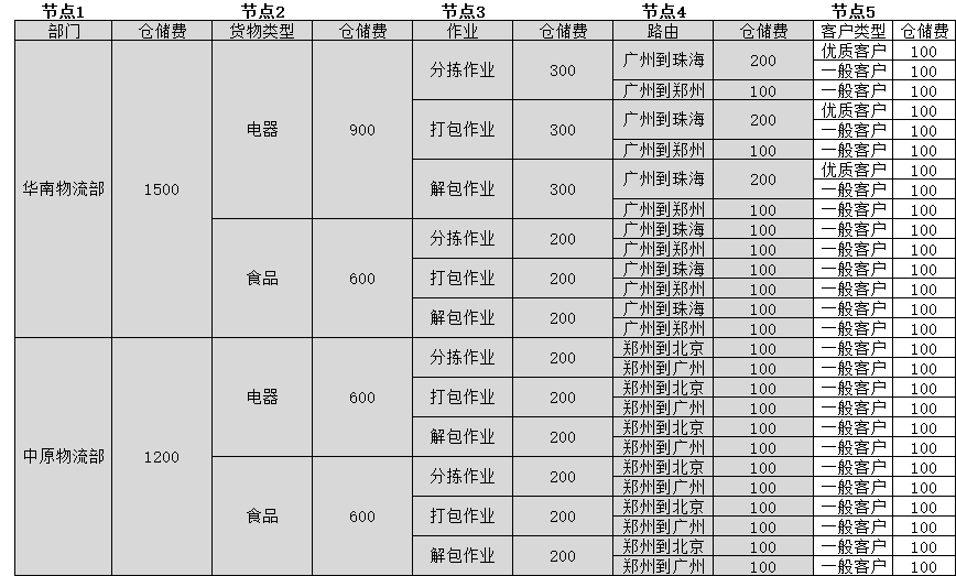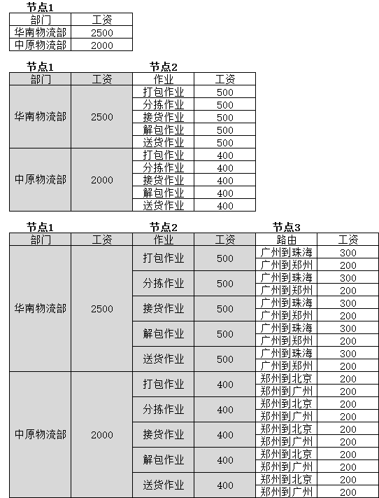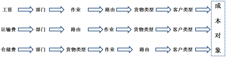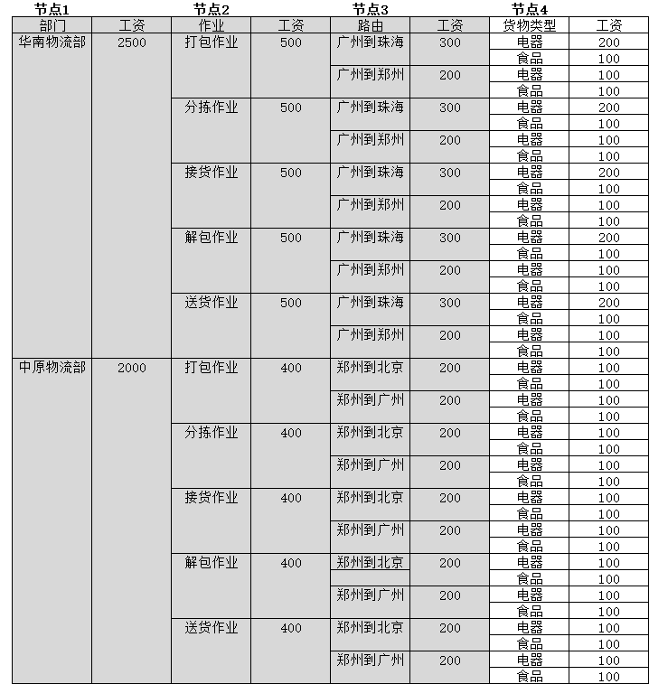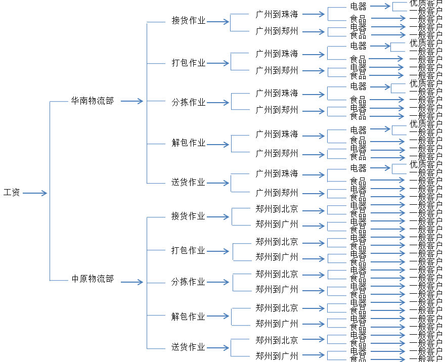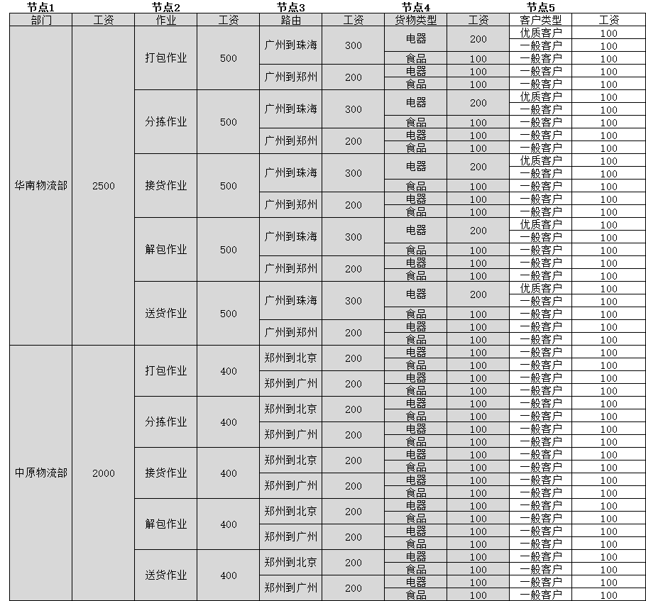 节点3:工资进一步向路由分摊。分摊标准可根据各路由的业务量、运输距离、运费、作业工时、作业次数等确定。不同作业的成本向路由进行分摊,选用的分摊标准可能是不同的。