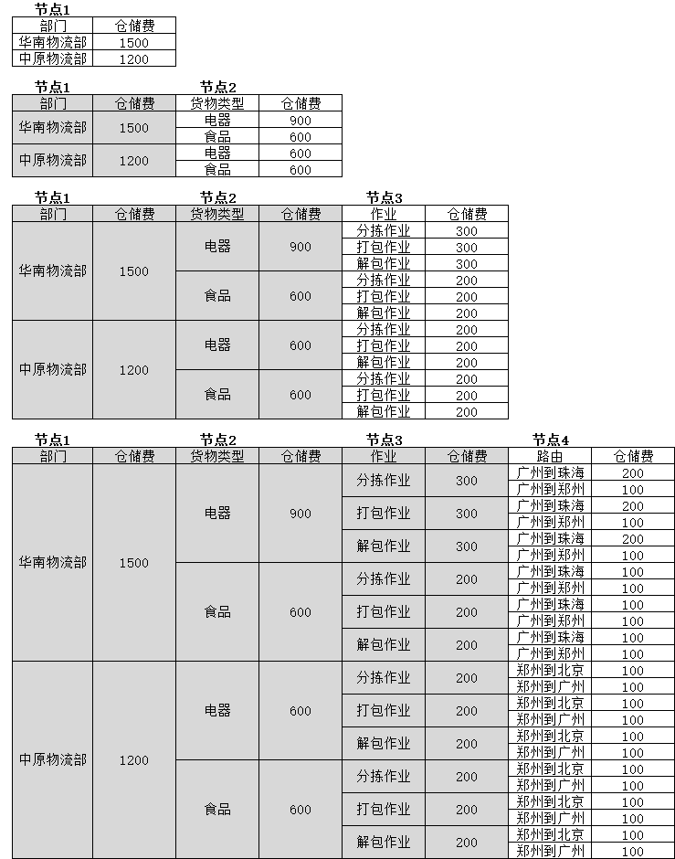 节点3:仓储费进一步向不同作业分摊。分摊标准可根据各作业人工工时、标准工时等。
