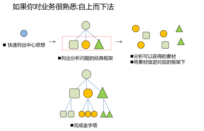 搭建逻辑架构的过程有两种。一种是自上而下的形式,当你对业务很熟悉的时候,你可以快速列出中心思想、问题的逻辑架构,然后分析可以获得的素材,将素材放到相应的架构下面,完成一个金字塔的框架结构。