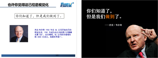 如图10-5所示,图左也是图文,图右也是图文,但是从视觉化的角度来讲,右边的图文更加具有冲击力,这种才是我们培训师的首选。
