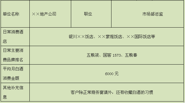 限制三公消费等政策的出台,无疑对高端白酒下了“逐杀令”。虽然没有让任何品牌消失,但是让每一个品牌都受到重创。茅台(飞天)、五粮液(52°)、国窖1573价格齐跌,洋河(梦之蓝)、舍得(52°)、汾酒等次高端产品更是没有了前几年的风采,其实这个过程没有行业发展和政府部门的对和错,笔者认为这是一个必然的发展结果,但这是让以这些产品得以生存的企业和商家,尤其是商家最痛苦的结果。我近两年来对山东、河北、宁夏、陕西等部分高档酒销量较好的商家逐一进行了分析和总结,得出一条较为有价值的结论——他们都建立了自己独有的数据库(如表1-1所示),并一直在本区域市场建立商家的诚信度和公信度,实现消费者精准营销。