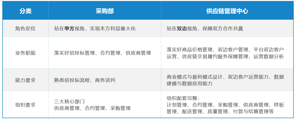原有采购部仅需懂招投标流程、商务谈判即可;现在需要关注商业模式与盈利模式、双边客户运营能力、数据建模与数据应用能力的培养。