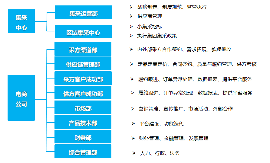 定位互联网电商平台,实施平台赋能,市场化运作。优势是打破原有采购体系,通过外部业务实现规模增量;通过B2B互联网思维和数字化手段吸引资本市场,有可能独立IPO,实现分拆上市。劣势是组织体系更为复杂,涵盖采购、财务、市场、IT缺一不可;服务的客户群主要是中小企业为主,与供应商自身的业务体系存在一定冲突。组织架构如图8-1-3所示:
