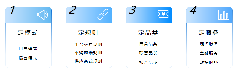 平台建设容易,但运营难。根据为央国企咨询时,总结提炼了四个关键要素,分别是定模式、定规则、定品类、定服务。如图8-2-1所示。