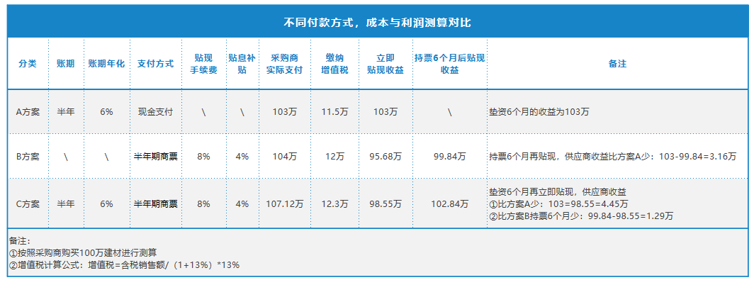 方案A:账期6个月、账期年化6%、现金支付,采购实际支付103万,供应商缴纳增值税11.5万,立即贴现收益为103万。垫资6个月的收益为100万。