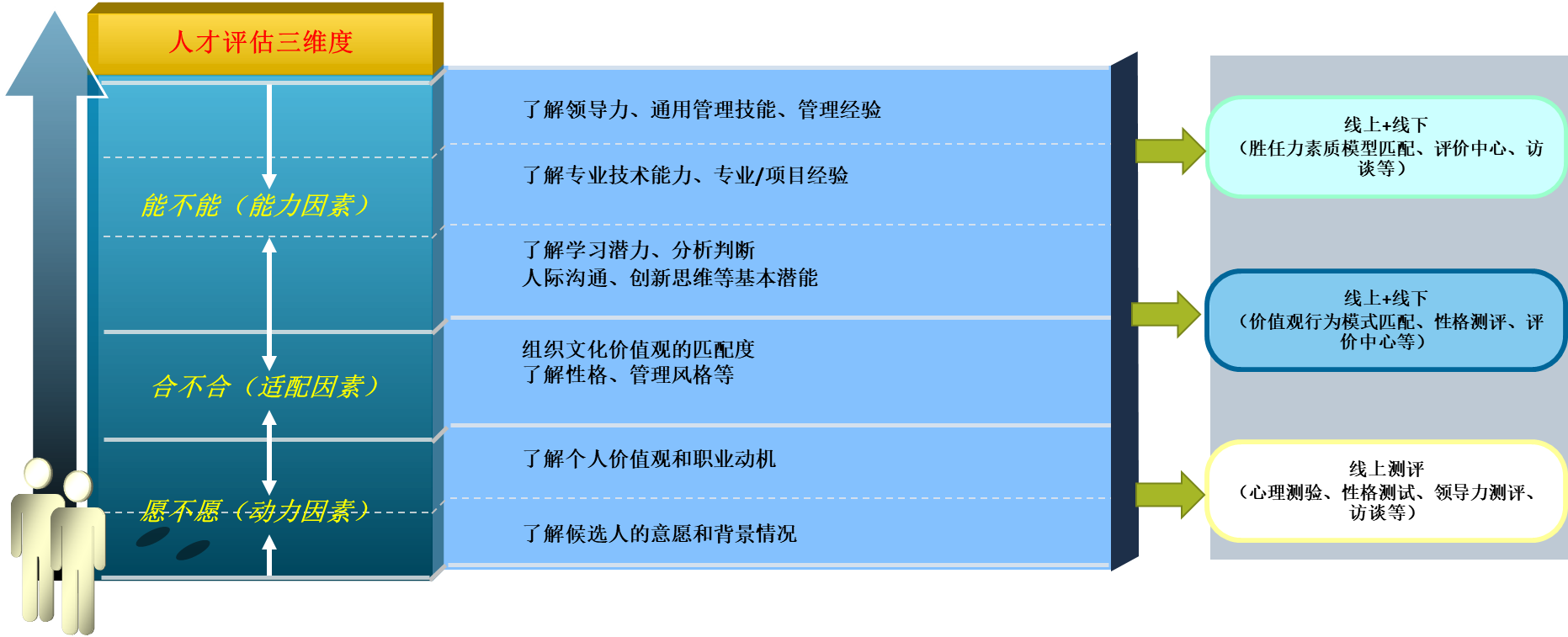 我将评价中心里所有的测评手段归纳为三个维度:能不能(能力因素)、