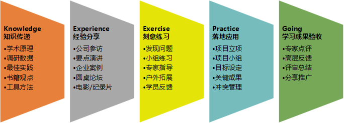 Learning by Doing(做中学)是最好的学习,也叫行动学习。具体来说,就是成立一个项目组就某一个现实中的问题设定目标、制订计划,然后小组群策群力解决这个问题,过程中通常会有导师支持、专家引导,辅以某些必要的课程、参访交流作为知识输入。