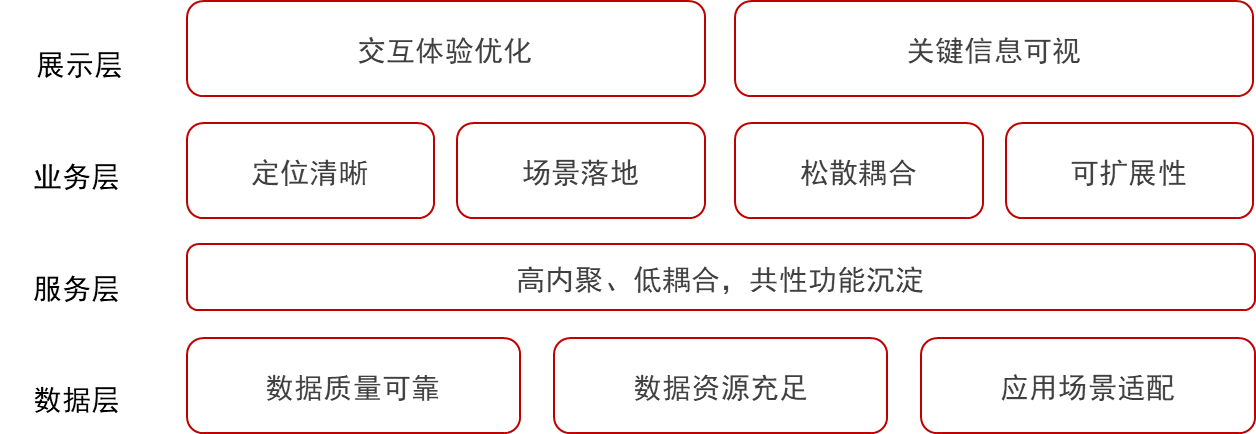 一是定位清晰,数据类应用通常在形式上比较新颖,系统功能所解决的问题和预期拟达到的业务目标需要明确;二是场景落地,数据类应用需要在特定的业务场景中才能够实际发挥出作用,业务功能的目标设计需要与工具的使用条件和数据资源基础相匹配;二是避免重复,功能设置上各自区分,重复功能开发产生资源浪费,同时也对用户使用造成困惑;三是松散耦合,应当尽可能地减少功能模块之间的依赖性,降低彼此耦合度,使得各模块更加独立、易于维护和测试;四是可扩展性,系统功能的设计应当比较容易进行维护和扩展,当需求发生变更或系统性能要求提升时,可以灵活地对功能进行修改或持续优化。