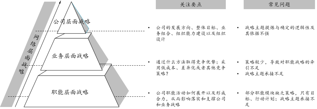 因此,本书关于战略划分依然是:公司层面战略、业务层面战略以及职能层面战略。网络层面战略仍在发展之中,一般将它视为公网层面战略的延伸,而本书把它视为公司层面、业务层面以及职能层面战略的延伸,原因在于在各个层面都可以与相应的利益相关者发生联系、合作和交易(在业务设计中,“活动范围”就描述了这些合作关系)。需要强调的是,同时三个层面的战略都整合在同一个框架——BLM框架。图1-8展示了战略内容三个不同层次的关注要点以及在实践中一些常见的问题。