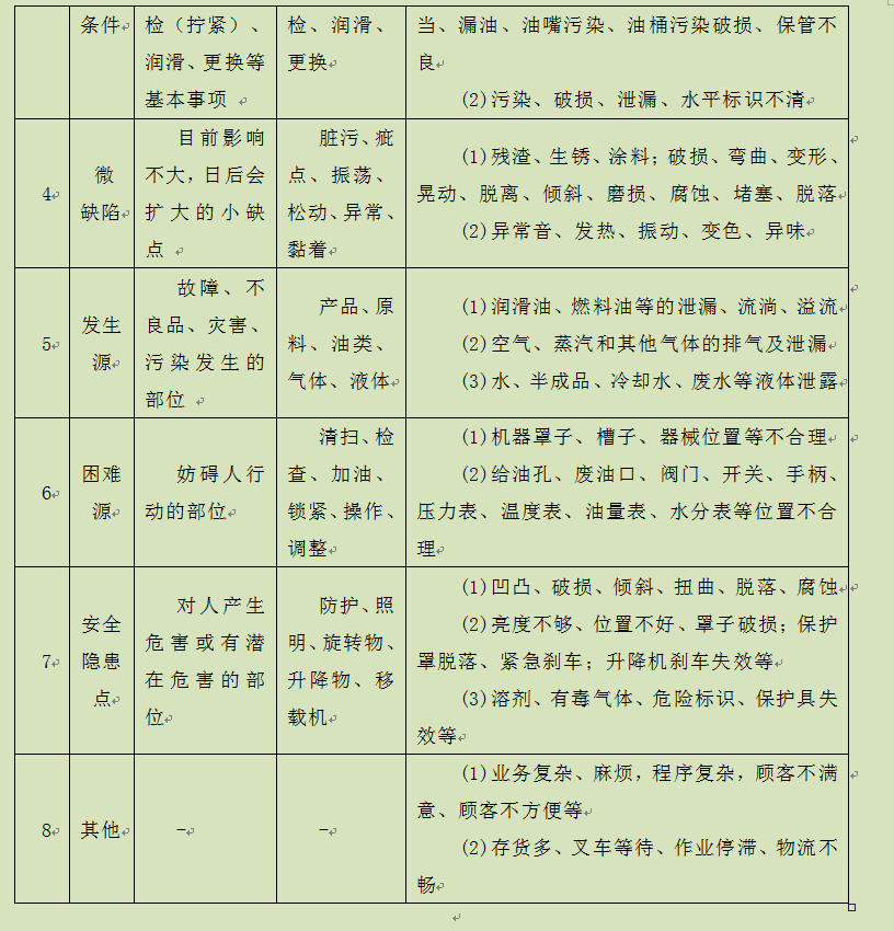 缺陷分区:A整理、B整顿、C微小缺陷、D清扫/注油/紧固、E困难部位、F发生源、G不安全部位、H其他