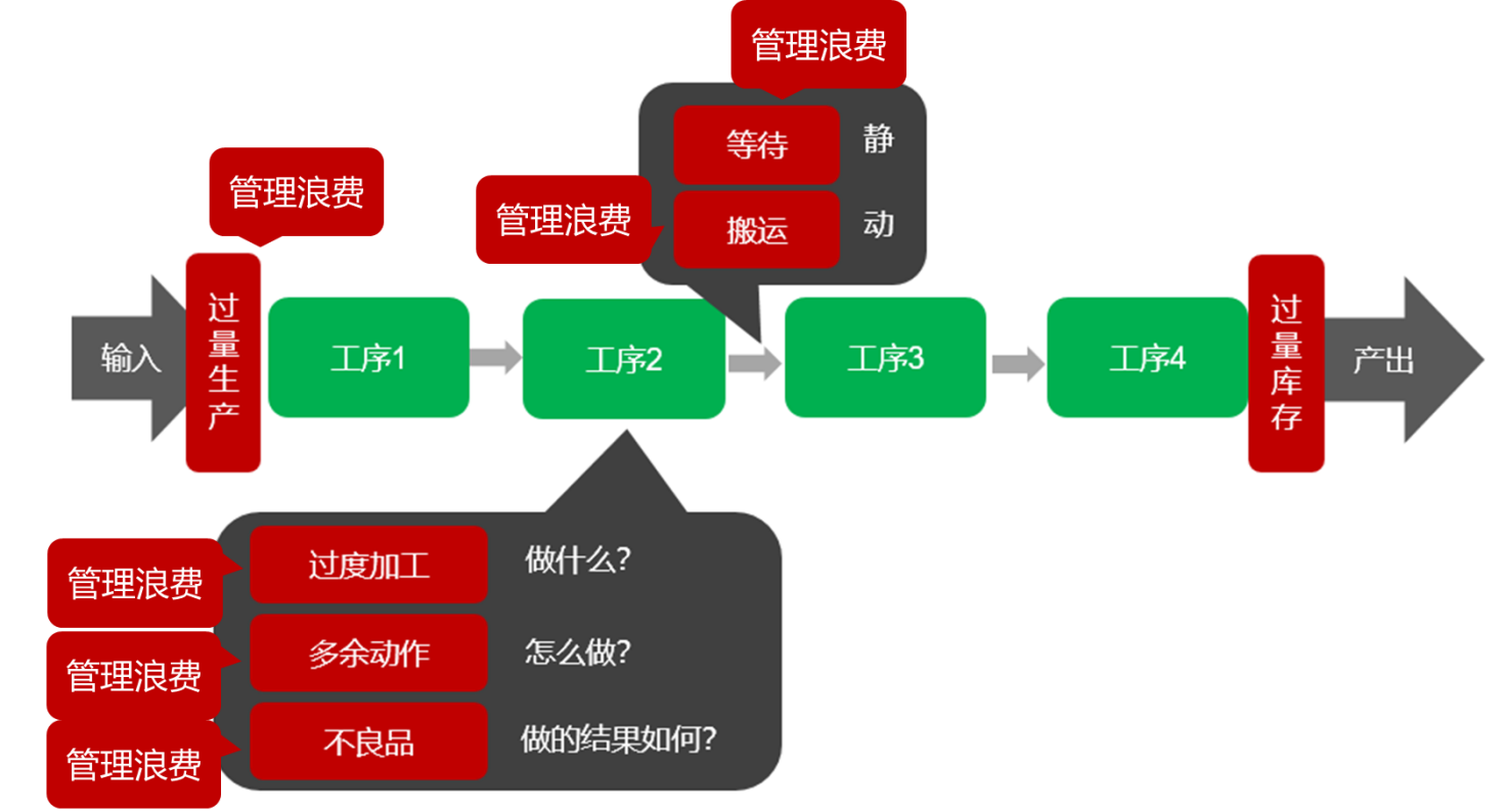 针对八大浪费的内容,可以使用3种方法进行识别,针对不同的浪费使用不同的浪费识别方法。