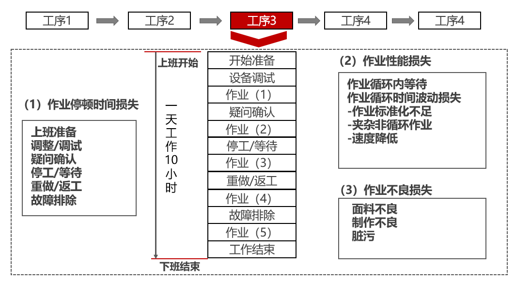 等待工作 | 整个班组面辅料等待,作业员机器维修等待,上一道工序流入的等待。 | 工序等待与流水平衡有关 |