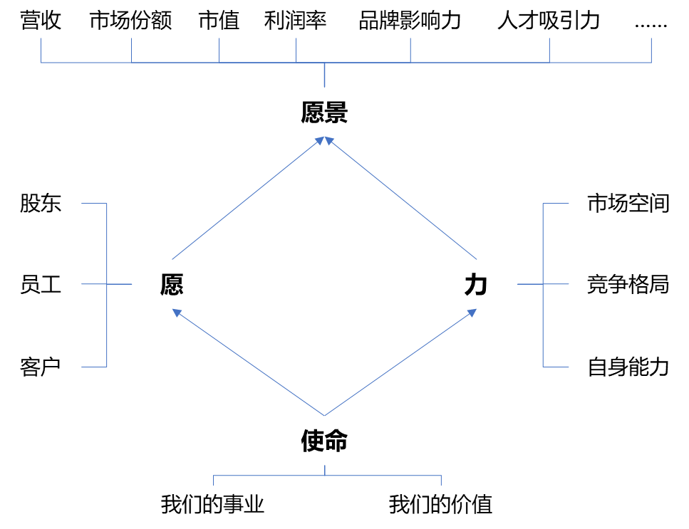 事实上,在梳理企业使命时也会遇到产业选择的问题,二者不同的是,使命主要是从客户需求和自身优势出发,找到企业的价值点,而愿景中的产业定位,更多的是基于股东、员工的欲求和自身的资源能力,选择企业的努力方向,理论上讲愿景确定的产业定位会大于使命中的产业选择,但也存在二者一致的情况。