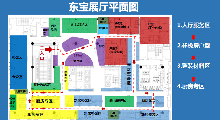 粗看这些动线和展示区没有啥特别之处,如果细细品味,就发现有很多创新之处。这里强调一点,装修公司动线设计最好是回型,最大利用空间,让客户看到更多的陈列,差一点的是U型,再差一点的是L型,其他左右分的完全不能考虑。