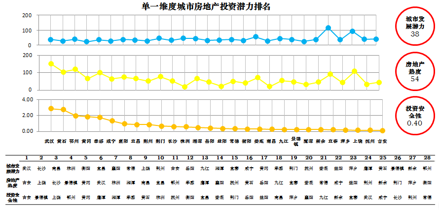 我们从城市发展潜力、房地产市场热度、投资安全性三个单一维度给出城市群各城市排名情况如下图: