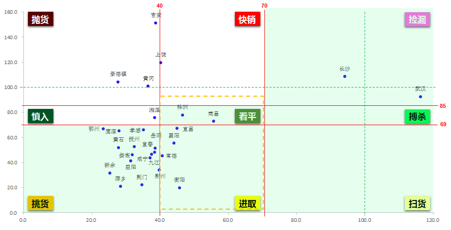 根据九宫格阶梯筛选法则,处在阶梯阴影区为重点拓展城市:黄线框内的重点拓展城市,主要包括常德、襄阳、宜昌,南昌、株洲、衡阳(衡阳如剔除城投自挂自摘影响,其市场热度会有较大幅度提升,但整体仍属于重点拓展城市);挑货区重点拓展城市有15个,除我司已进驻的岳阳、宜春、娄底、益阳外,还应关注九江、咸宁、荆州、鄂州、鹰潭、孝感、黄石、抚州、荆门、萍乡、新余等15个城市;上饶处在快销区,应注意风险防控。