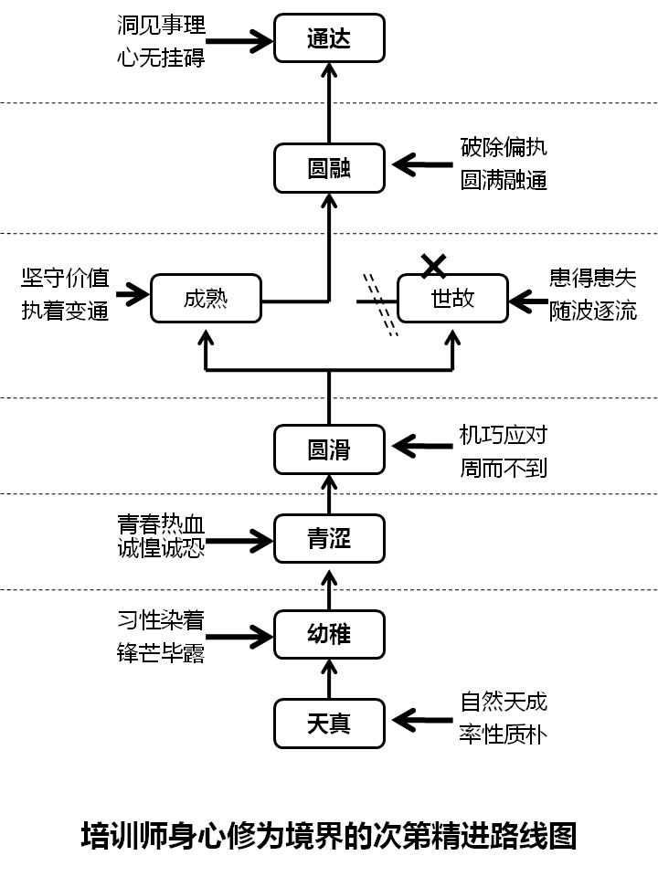在具体介绍“随顺应化”境界之前,我们先来梳理一下,培训师身心修为过程中会经历哪一些境界层级。