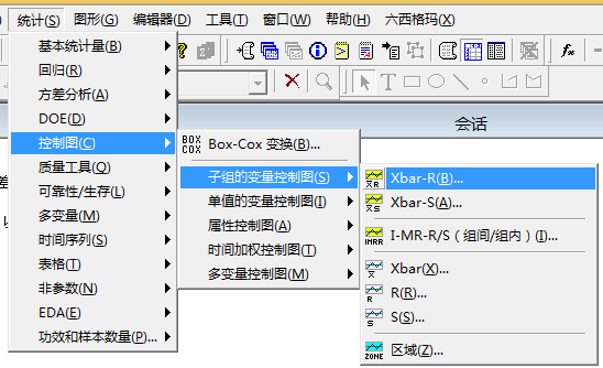 (1)“统计-控制图-子组的变量控制图-Xbar-R”进入,如图1-24所示。从图中可以看到其他控制图也可以选择相应的命令进行操作运行。