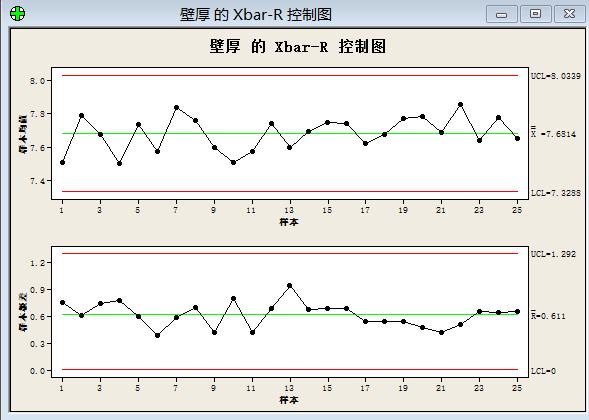 某钢管厂连续生产的钢管,壁厚是一个重要尺寸。对钢管壁厚进行控制,每隔1小时抽样1次,每次抽取5根钢管,共抽样25次,测量并记录数据。经检验,钢管壁厚服从正态分布,绘制Xbar-R图,如表1-14所示。