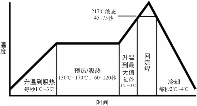 回流焊的作用是把焊膏固化成焊点,从而把元件焊接在PCB上。其中,包含对PCB加热及其他两个步骤: