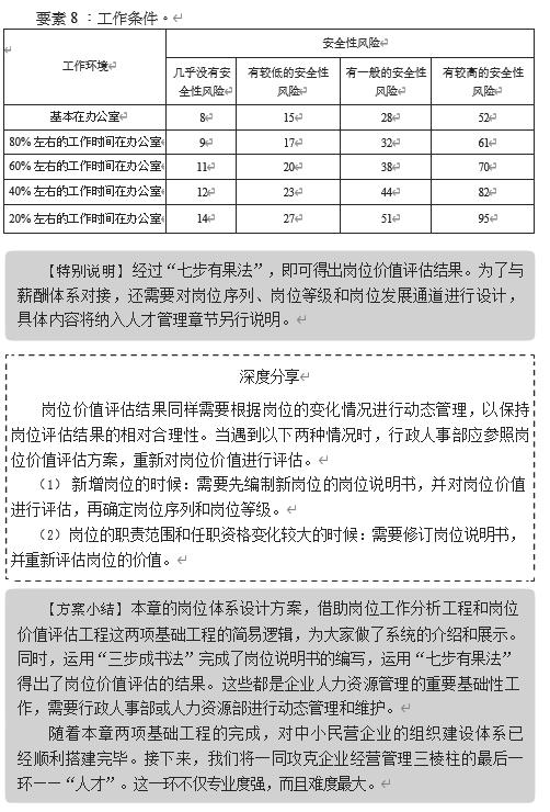 (2) 岗位价值评估工程:包括岗位价值评估方案、岗位序列、岗位等级,以及岗位价值评估结果的实际应用。该工程的重点成果是各岗位的相对价值点数,即“岗位价值评估结果汇总表”。